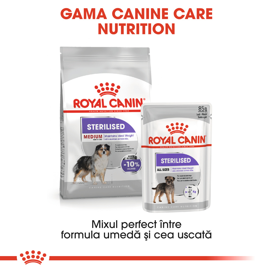 Dupa sterilizare, metabolismul cainelui incetineste, insa pofta de mancare poate ramane la fel de intensa. In plus, activitatea fizica poate scadea, ceea ce creste riscul de acumulare a kilogramelor in plus. Royal Canin Sterilised Medium a fost special formulata pentru a sprijini mentinerea unei greutati sanatoase la cainii adulti sterilizati de talie medie, cu varsta peste 12 luni si greutatea intre 11 si 25 kg.