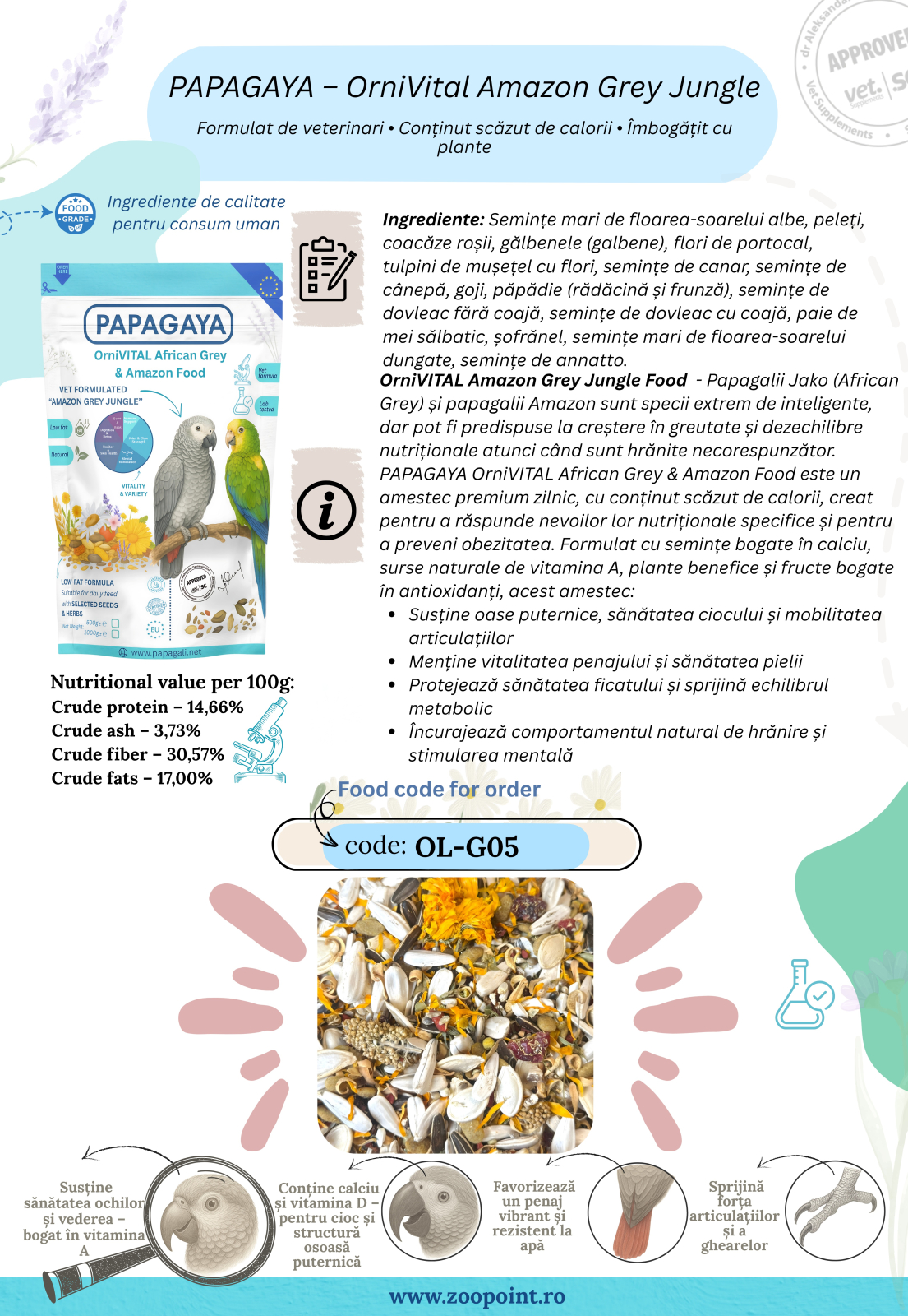 Papagalii Jaco si Amazon sunt predispusi la obezitate si dezechilibre nutritionale atunci cand dieta nu este corect formulata. Aceasta reteta a fost dezvoltata pentru a: sustine controlul greutatii, oferi energie echilibrata, sprijini sanatatea generala pe termen lung.