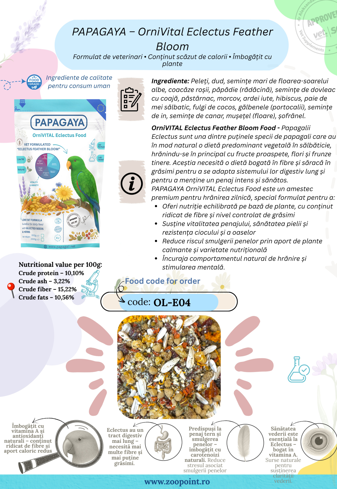 OrniVital Eclectus Feather Bloom este o formula Super Premium specializata, creata pentru papagalii Eclectus, o specie unica cu nevoi nutritionale diferite, predispusa la obezitate si afectiuni hepatice.