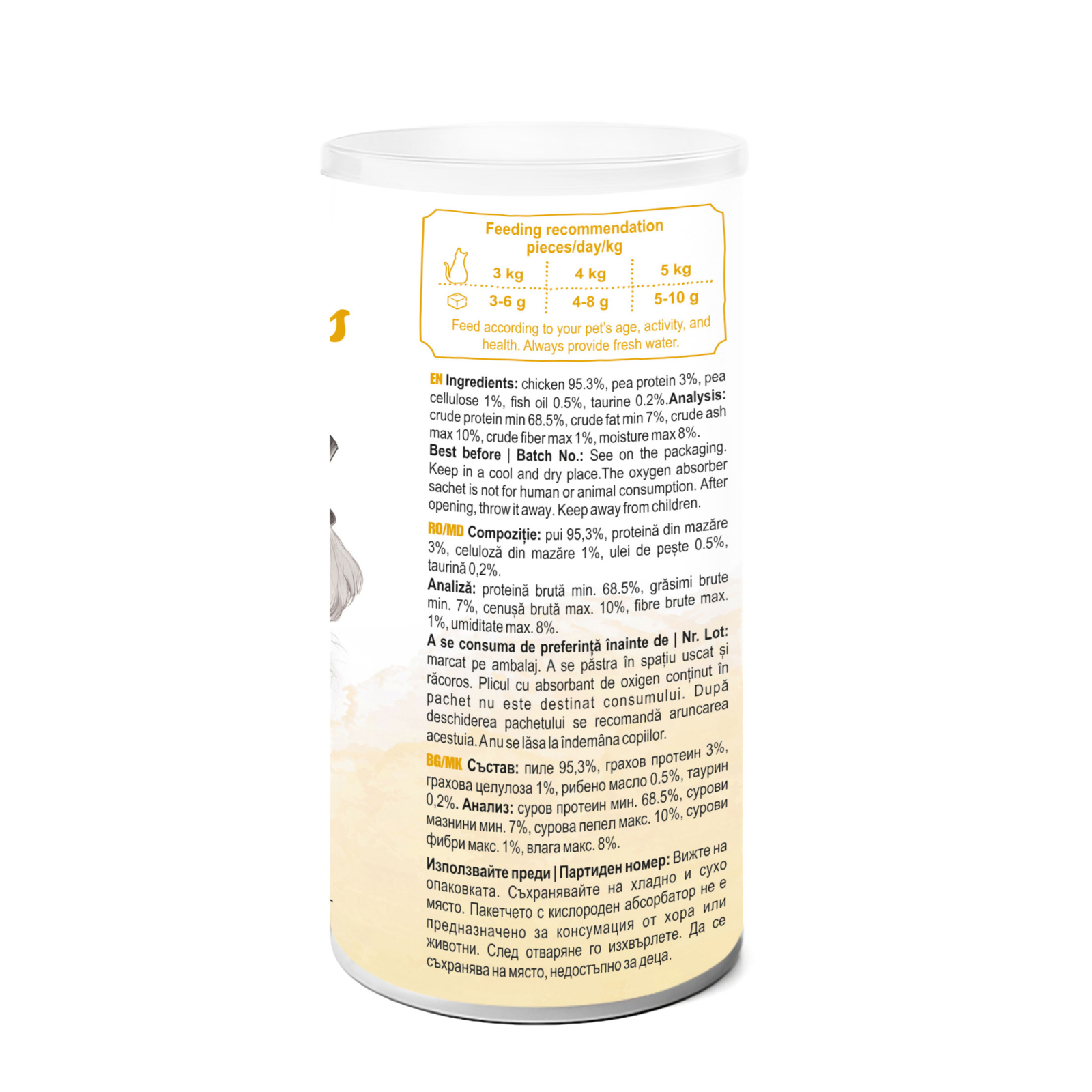 Contine 95,3% carne de pui, bogata in proteine si cu aroma intensa, perfecta pentru animalele care apreciaza gustul autentic de carne. Fara coloranti si fara cereale, formula este bogata in proteine si usor de digerat, oferind energie si sprijin pentru masa musculara.
