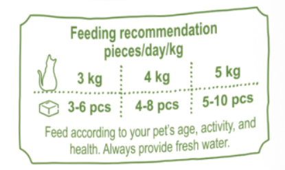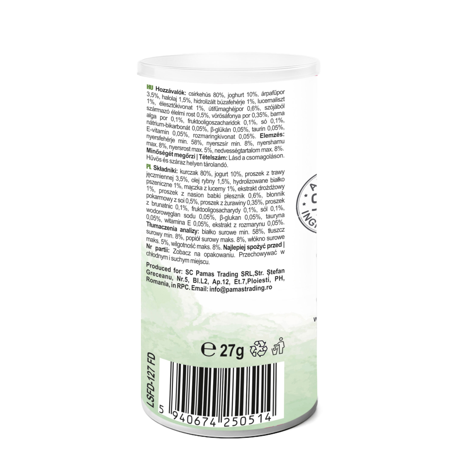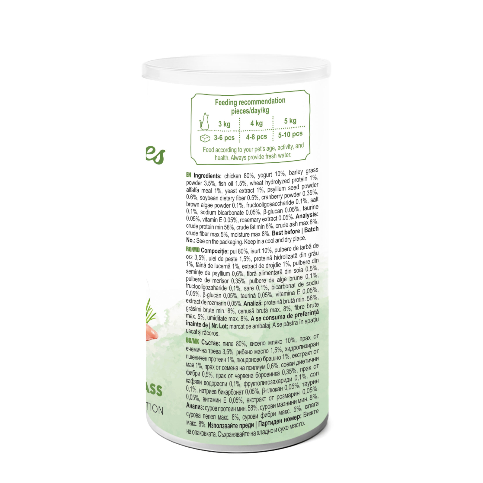 Pui 80%, iaurt 10%, pulbere de iarba de orz 3,5%, ulei de peste 1,5%, proteina hidrolizata din grau 1%, faina de lucerna 1%, extract de drojdie 1%, pulbere de seminte de psyllium 0,6%, fibra alimentara din soia 0,5%, pulbere de merisor 0,35%, pulbere de alge brune 0,1%, fructooligozaharide 0,1%, sare 0,1%, bicarbonat de sodiu 0,05%, β-glucan 0,05%, taurina 0,05%, vitamina E 0,05%, extract de rozmarin 0,05%.
