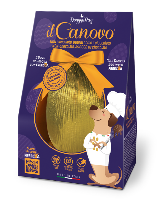 De Paste, si prietenii nostri patrupezi merita un rasfat special. Canovo este oul creat special pentru caini, realizat cu Freecoa – alternativa la ciocolata, la fel de gustoasa, dar complet sigura pentru sanatatea lor.