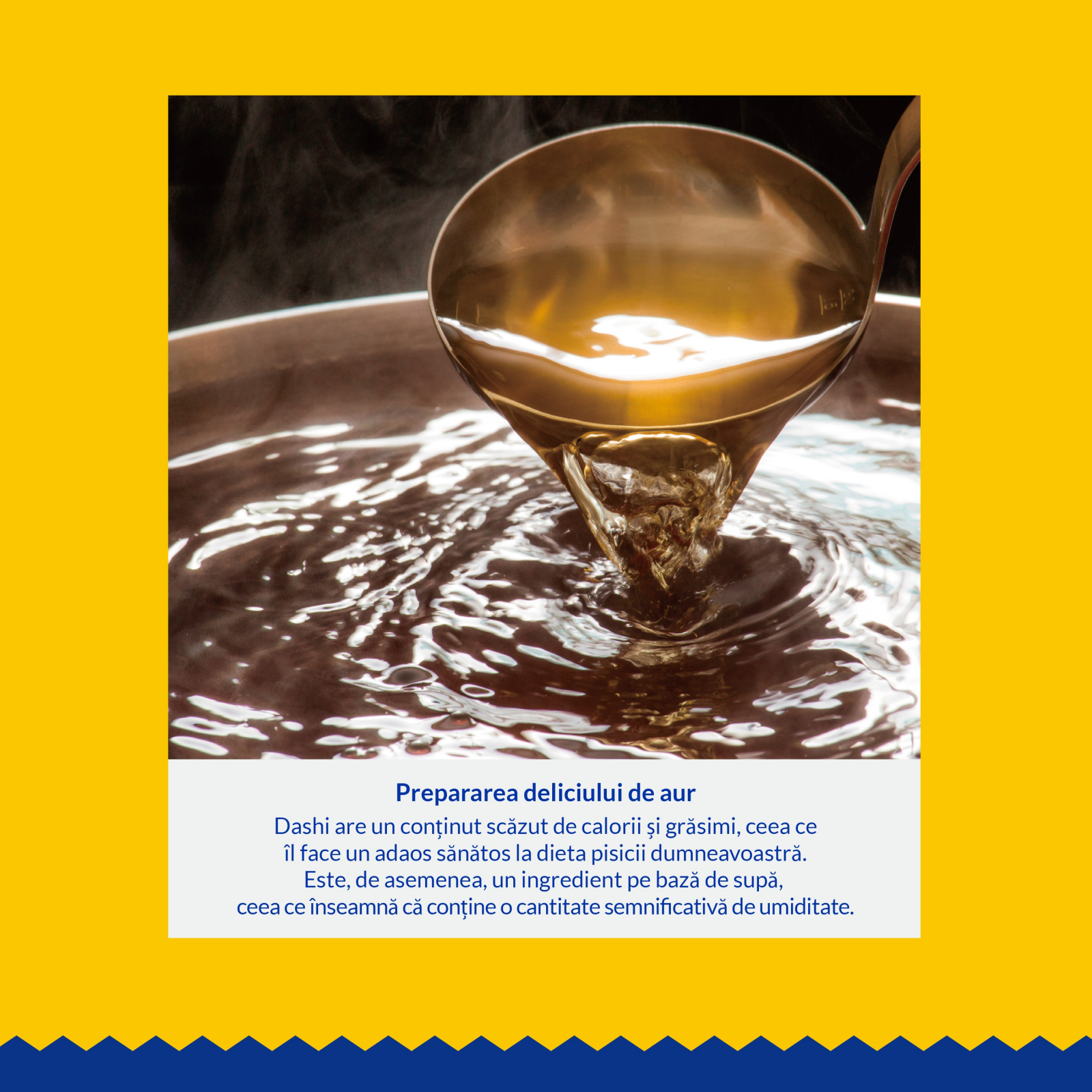 Dashi este un bulion japonez traditional realizat prin fierberea indelungata a fulgilor de ton uscat (bonito), care ofera o aroma bogata, cunoscuta sub numele de „umami” – gustul natural pe care pisicile il adora.