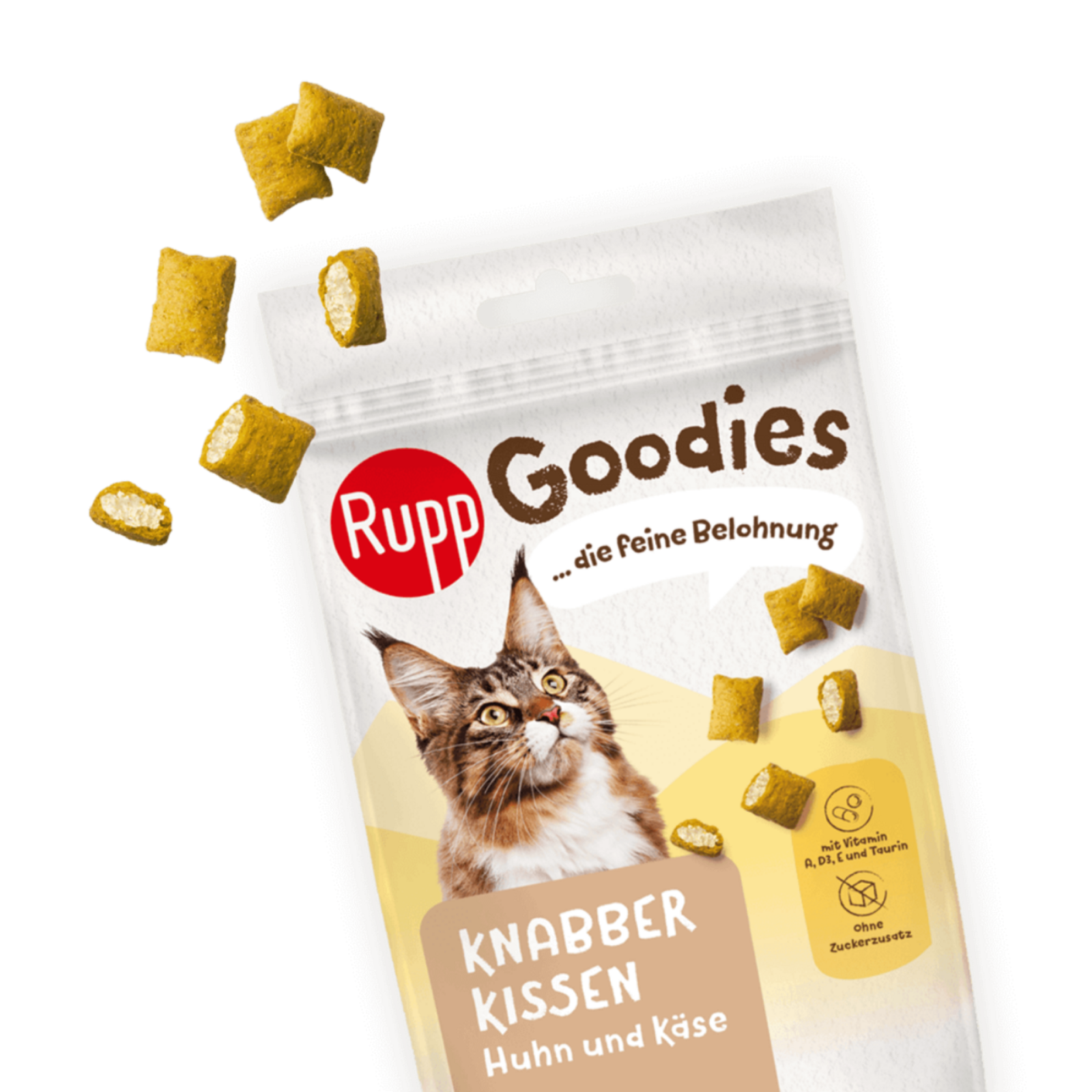 Rupp Goodies Cat sunt gustari delicioase pentru pisici, sub forma de pernite crocante la exterior si cremoase la interior. Fiecare perna este umpluta cu o crema savuroasa cu aroma de pui si branza, fiind perfecta ca recompensa sau gustare intre mese.