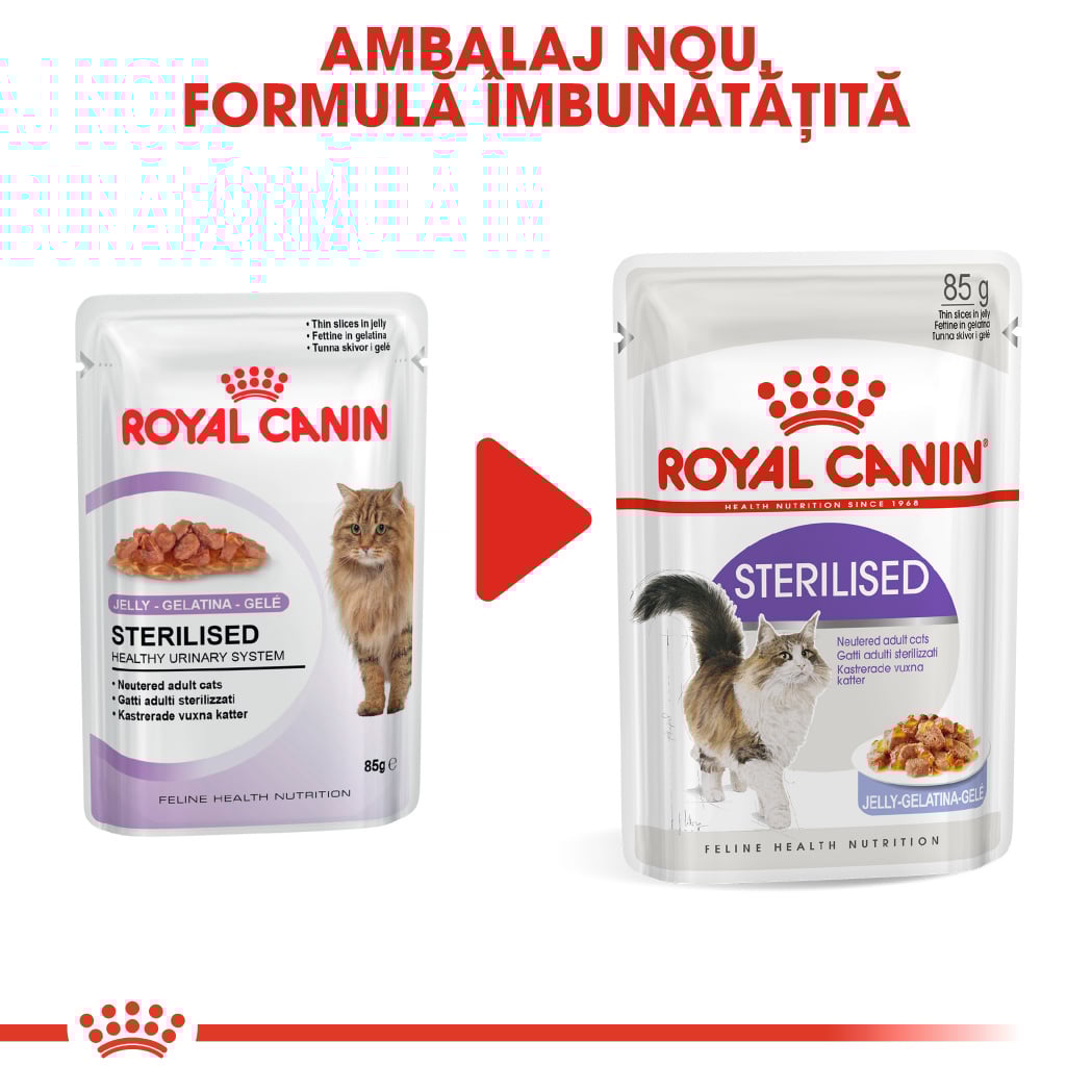 Sterilizarea schimba cerintele nutritionale ale pisicilor adulte, reducand necesarul energetic si nivelul de activitate. Royal Canin Sterilised in Jelly este conceputa special pentru a raspunde acestor nevoi. Cu un continut moderat de grasime si energie controlata, ajuta la mentinerea greutatii ideale, mai ales atunci cand este servita in portii zilnice corect masurate.