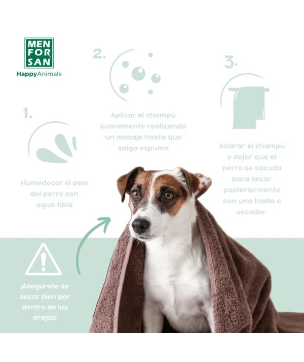 Umeziti bine blana cainelui cu apa calda. Aplicati sampon pe gat, spate, trunchi si picioare. Masati usor pana se formeaza o spuma bogata si cremoasa, apoi lasati sa actioneze cateva momente. Clatiti cu apa din abundenta si permiteti cainelui sa se scuture. Stergeti cu un prosop si indepartati orice urma de umezeala folosind un uscator, in timp ce periati blana.
